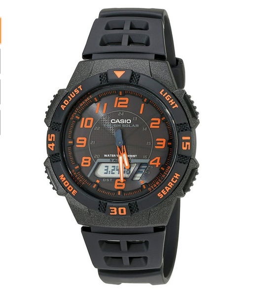 �(yōu)惠力�:CASIO卡西歐的這款AQS800W-1B2VCF手表采用日本石英機芯,模�+�(shù)字雙�,TOUCH SOLAR光動能技�(shù)可以吸收可見光源為手表維持電�,太陽能充電電池。充足電后可以在黑暗中用10個月。電池壽命在10年以�。大�(shù)字位顯示更直觀,超薄設�,簡單有�。其他參�(shù)方面�100米防��1/100秒表、自動日�、可定義5個鬧�、世界時間等CASIO�(jīng)典電子表的功能一應俱全。表盤直�41.5mm,厚度為10.7mm,橡膠表�,數(shù)字位及模擬指針帶夜光功能。美亞原�$49.95,現(xiàn)特價$20.4,約131��