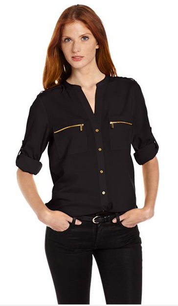 �(yōu)惠力�:Calvin Klein Modern 女士拉鏈紐扣襯衫,采用滌綸材質制成,清爽透氣。領口采用圓領設�,與恰到好處的紐扣扣位相銜接,在視覺上拉長頸部線�??删硇湫淇诟鰰r尚感;胸前還點綴有兩個拉鏈口袋,款式寬松,適合任意體型的女生。搭配鉛筆褲、短褲以及九分褲等都不錯。原�$89,現(xiàn)黑色款XS碼特�$44.48,約295元�